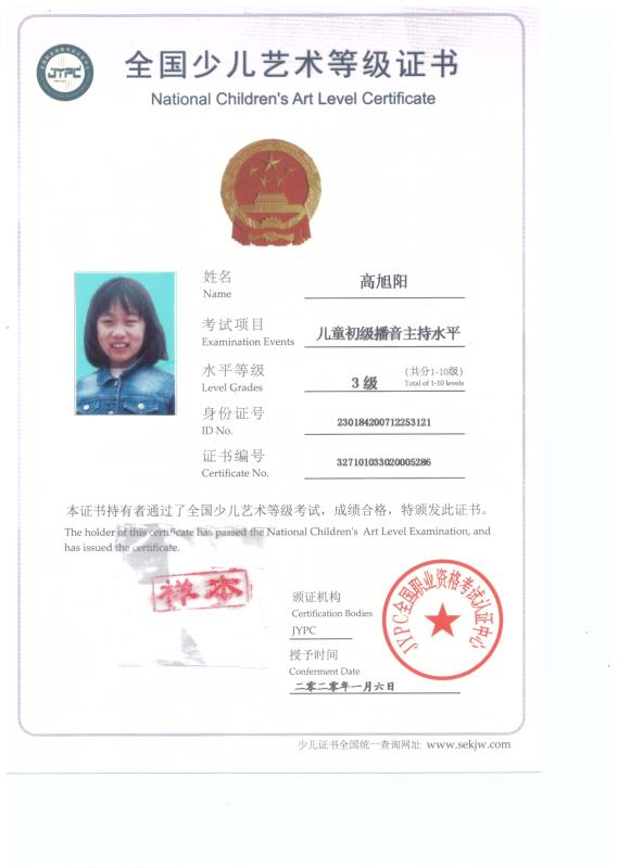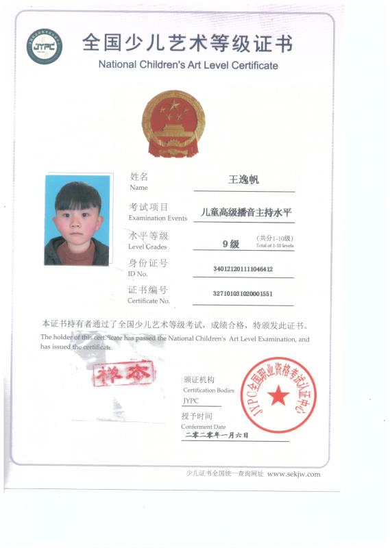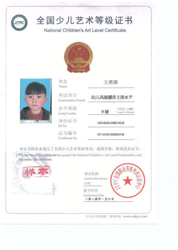 2020新版少儿考级证书样本展示